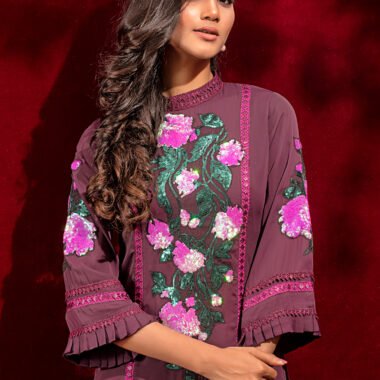 Georgette long kameez has round neck with lace details, has hand embroidery work on front part, front waistline has pin tucks, contrast hem with lace details, has three quarter sleeve with stone buttons, has zipper on back side.