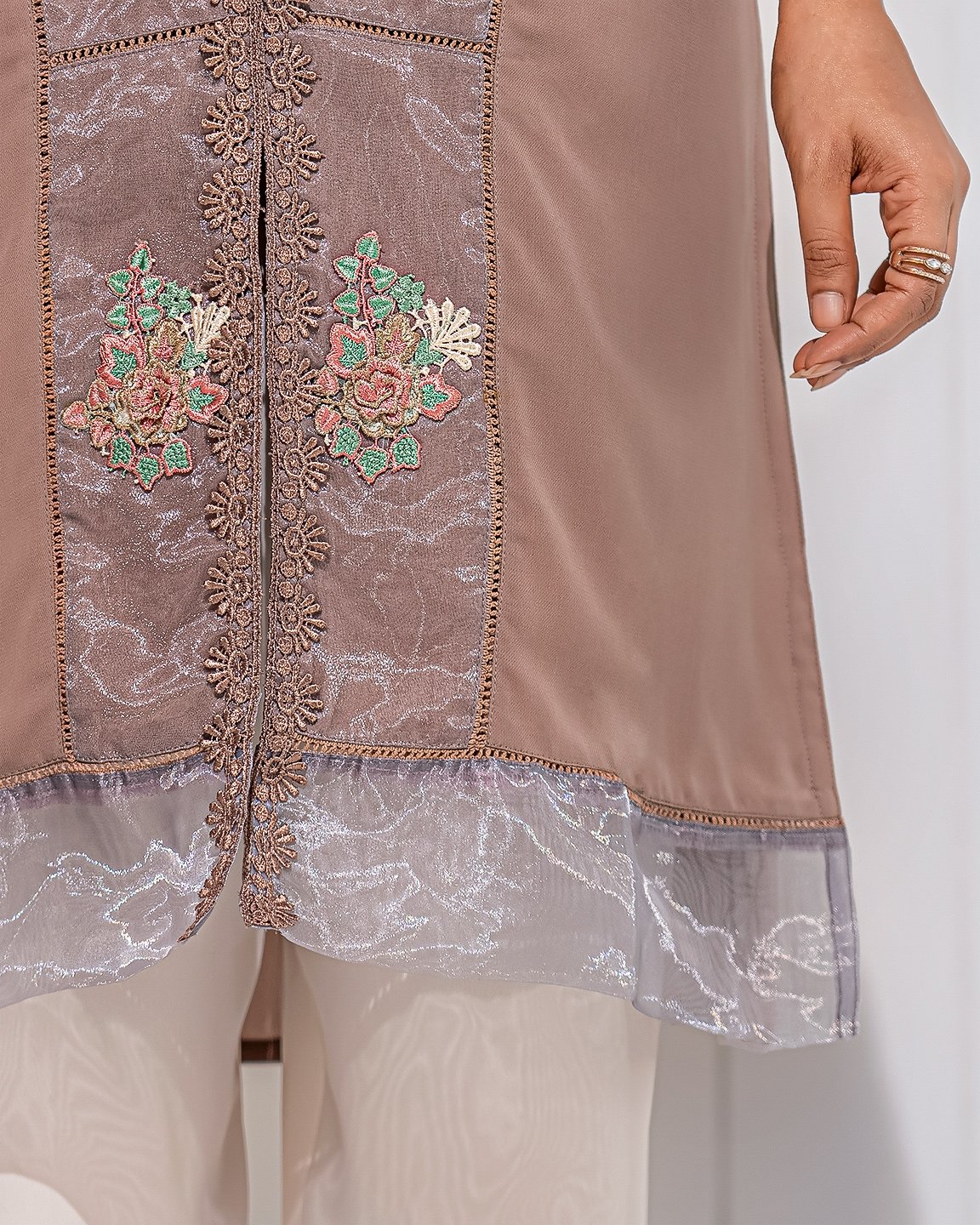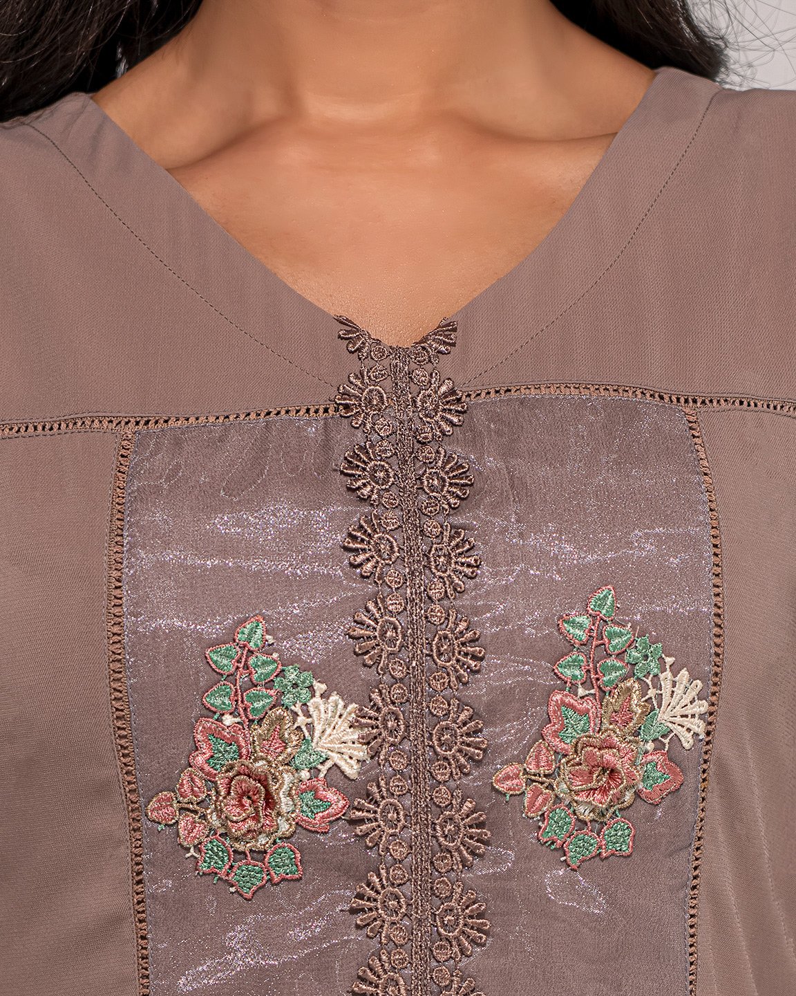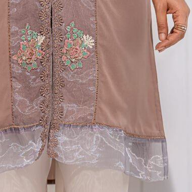 Georgette A-line long kamiz has V-neck, has three quarter flared sleeve with contrast & lace details, front part has floral motif in contrast box pannel with join lace, Long kamiz has both side & center front slit, center front has lace details, hemline has contrast pannel.