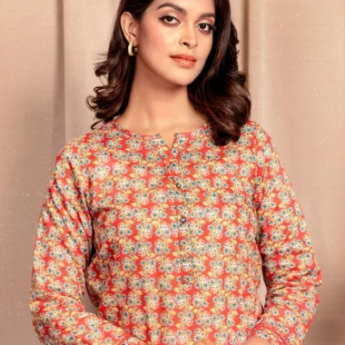 Fine Cotton A-line Short kameez has Round-neck details, has front button placket with button details, has full sleeve with lace details, has front both side slit lace details, has back yoke with box pleat details, has both side slits for easy to wear.