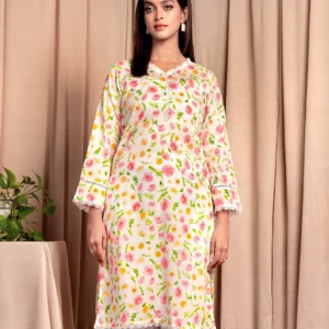 Fine Cotton A-line long kurta has V-neck with lace details , has full sleeve with join lace details, has front hemline lace details, has both side slits for easy to wear.