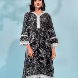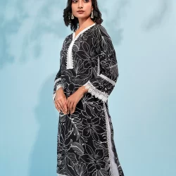 Cotton A-line long kamiz has curved v-neck with contrast pipin & lace details, has front hemline lace details, has full sleeve with hem lace details, has bothside slits with lace details.