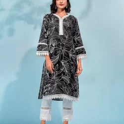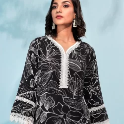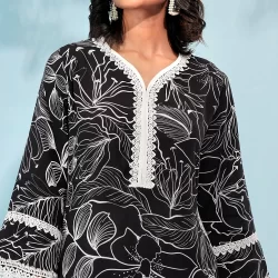 Cotton A-line kurta has v neck neck, has front placket with lace details, has bothside slits, has full sleeve with hemline lace details, has wide hem bottom with hemline lace details, has back side cut, has front waist band & back side has elastic.