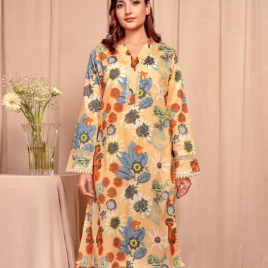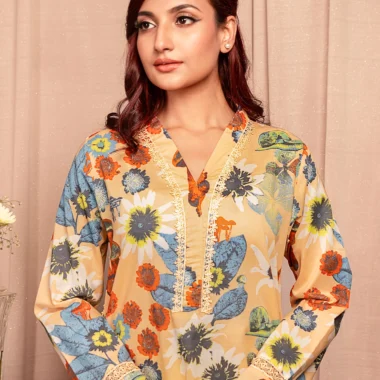 Fine Cotton A-line Short kamiz has V-neck with lace details , has front show button details, has full sleeve with join lace details, has front both side lace details, has back yoke with gather details, has both side slits for easy to wear.