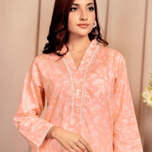 Fine Cotton A-line long kamiz has V-neck with lace details , has front show button details, has full sleeve with contrast pipin and lace details, has hemline join lace details, has bothside slits with contrast pipin for easy to wear.