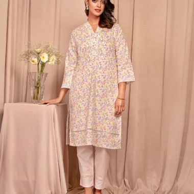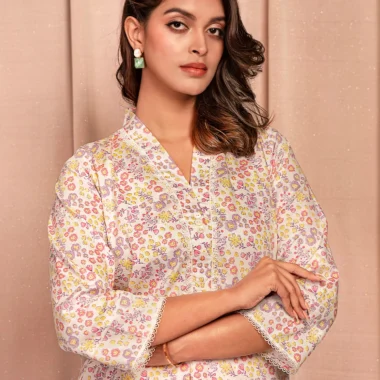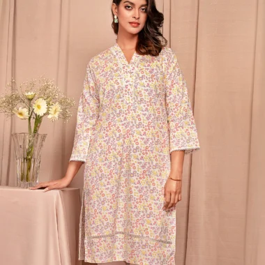 Fine Cotton A-line long kamiz has V-neck with lace details , has front show button details, has full sleeve with contrast pipin and lace details, has hemline join lace details, has bothside slits with contrast pipin for easy to wear.