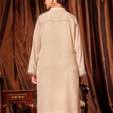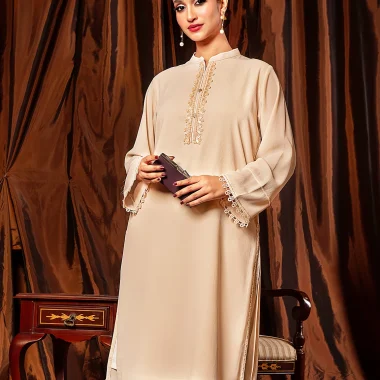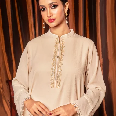 Female Band Collar- Neck Details Fine Crepe Georgette Long Kameez | Biscuit