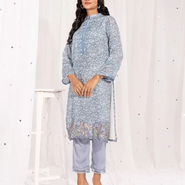Luxury Georgette Long Kameez has Band Collar with lace details, has a front neckline with contrast piping and lace details, has full sleeve with lace and contrast piping details, hemline has hand embroidery work details, has both side slits, has butter lining for comfort & easy.