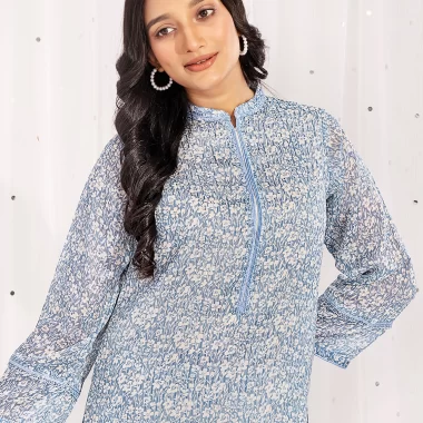 Female Band Collar- Neck Details Long Kameez | Blue White