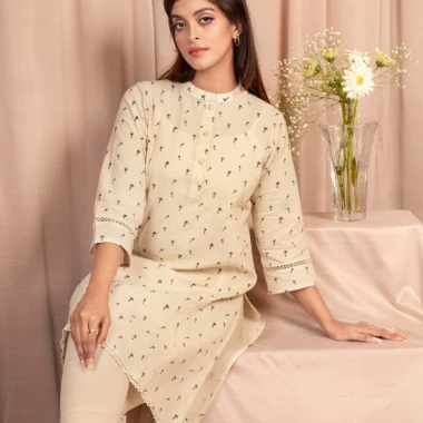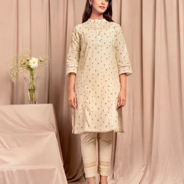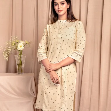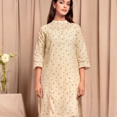 Fine Cotton A-line long kameez has Band collar-neck details, has front placket with functional button details, has front armhole princess line and join lace details, has three quarter sleeve with join lace details, has hemline lace details, has both side slits for easy to wear.