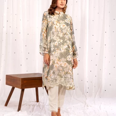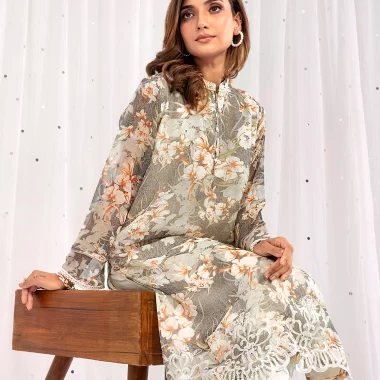 Luxury Printed Georgette Short Kameez has a Band collar Neck with lace details, has full sleeve with contrast piping and lace details, hemline has hand embroidery work details, has both side slits, has butter lining for comfort & easy.