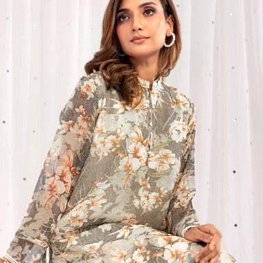 Female Band Collar- Neck Details Luxury Printed Georgette Short Kameez | Ash Black