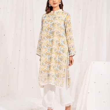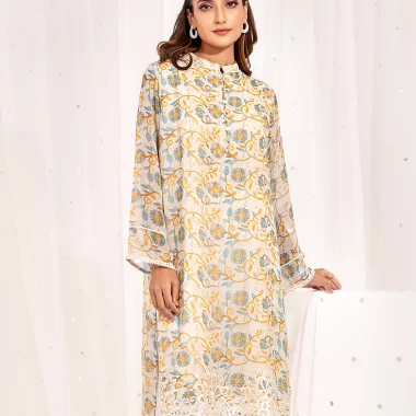 Female Band Collar- Neck Details Luxury Printed Georgette Short Kameez | Cream White