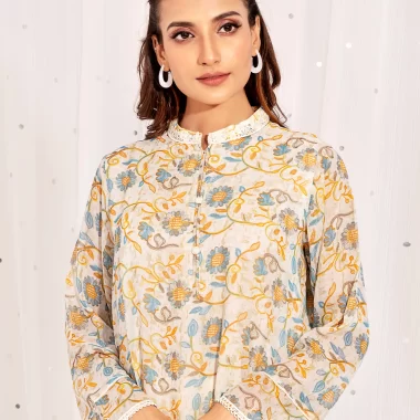 Luxury Printed Georgette Short Kameez has a Band collar Neck with lace details, has full sleeve with contrast piping and lace details, hemline has hand embroidery work details, has both side slits, has butter lining for comfort & easy.