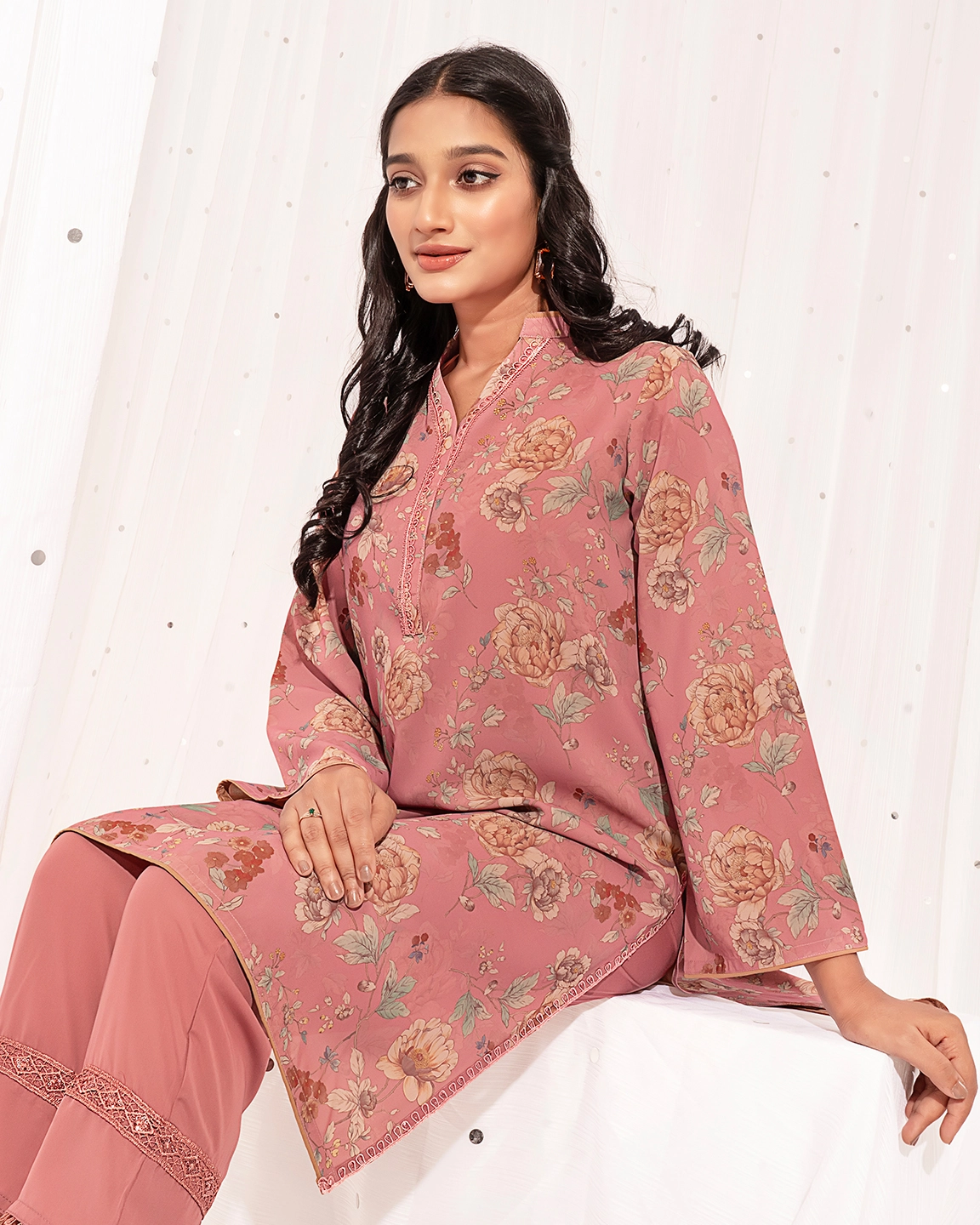 Female Band Collar-V Neck Details Luxury Printed Georgette Short Kameez | Mauvwood Pink