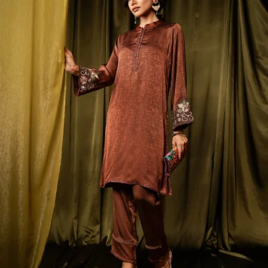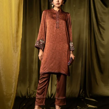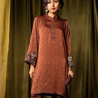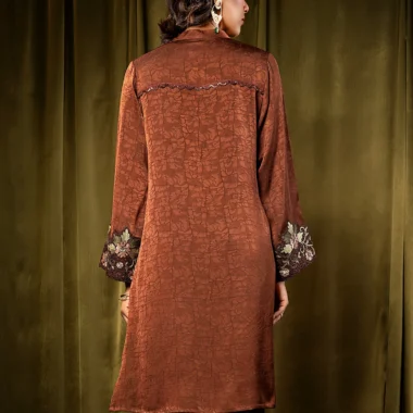 Female Band Collar- Neck Details Short Kamiz | Cinnamon Brown