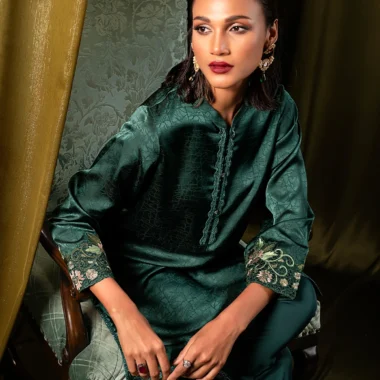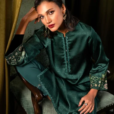 Luxury Double Silk Short kameez has band collar, has front placket with lace details, has both side slits, side slits & hemline has lace details, has full sleeve with hemline embroidery work, back side has back yoke with lace details.
