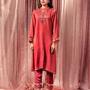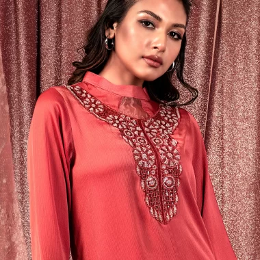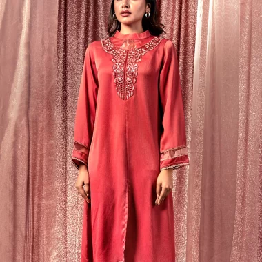 Female Band Collar & Neckline Embroidery Work Long Kameez | Mauvewood Pink