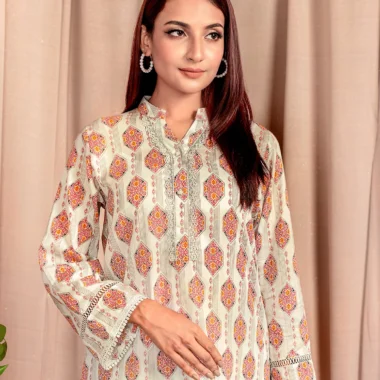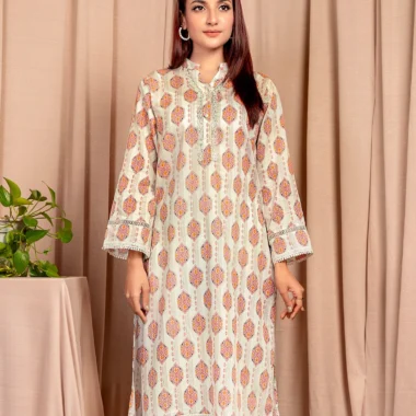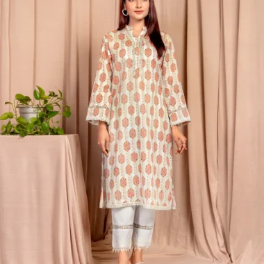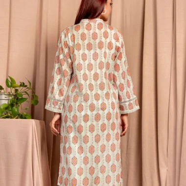 Fine Cotton A-line long kamiz has band collar and placket button with lace details , has front placket with lace and show button details, has full sleeve with join lace details, has both side slits with contrast pipin for easy to wear.