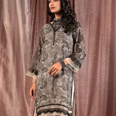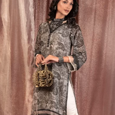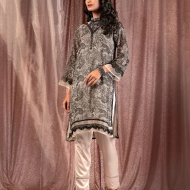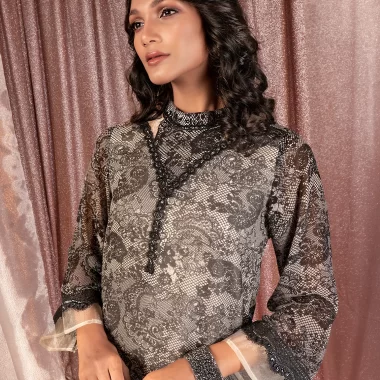 Female Band-Collar with Lace details Long Kameez | Black Print