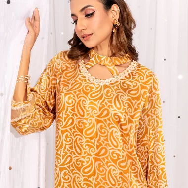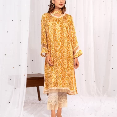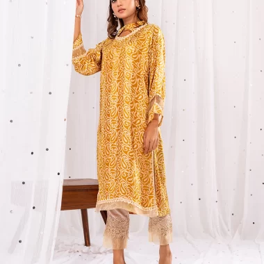 Female Band Twisted Collar with lace Details Long Kameez | Jade Yellow