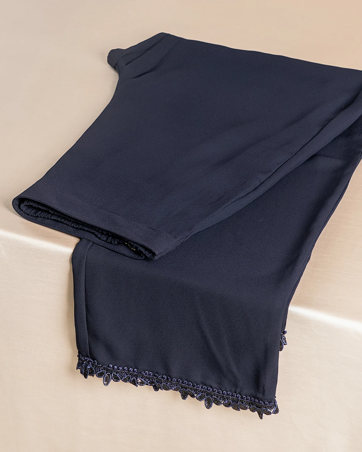 Product Description: Luxury Double Silk Regular Fit Bottom has wide hem details, has hemline lace detyails, has side zipper with hook details, has front waist band & back side has elastic.