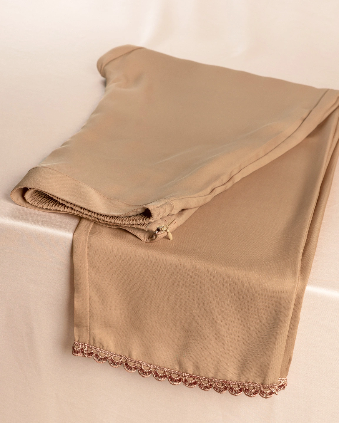 Product Description: A sleek Beige Brown bottom with a stretchable elastic waistband for flexible fit and a side opening with a concealed zipper, secured with a metal hook closure for added hold. Finished with a refined hem and delicate detailing, this bottom is perfect for pairing with kameez for festive-ready style.