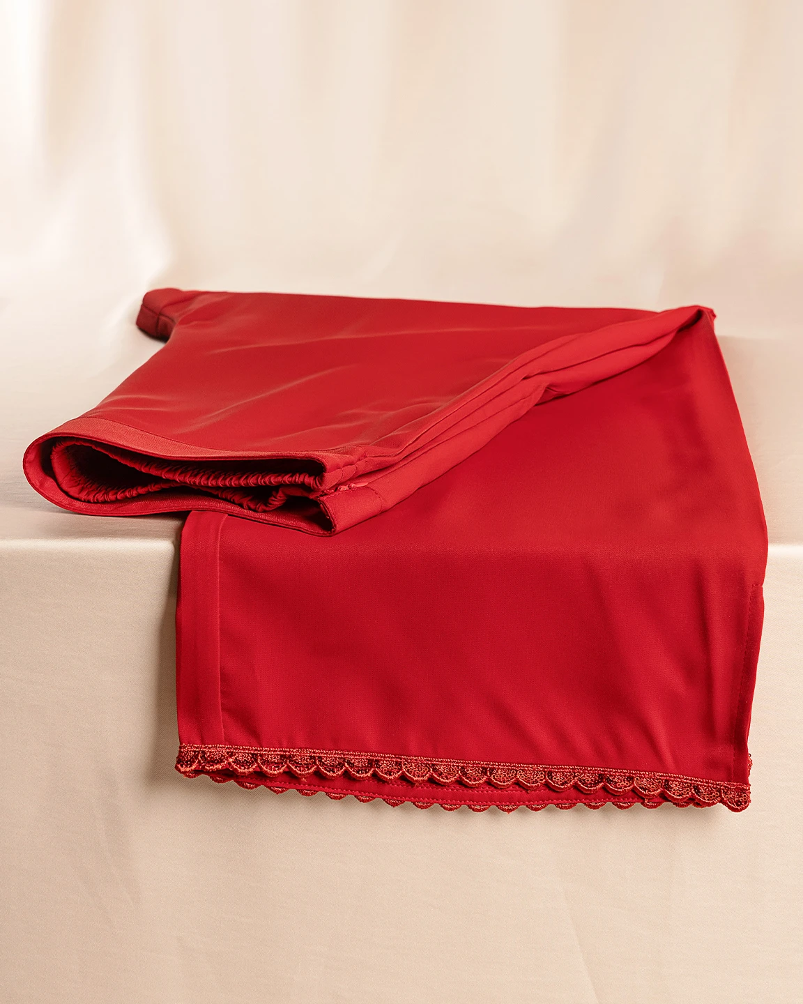 Product Description: A sleek Blood Red bottom with a stretchable elastic waistband for flexible fit and a side opening with a concealed zipper, secured with a metal hook closure for added hold. Finished with a refined hem and delicate detailing, this bottom is perfect for pairing with kameez for festive-ready style.