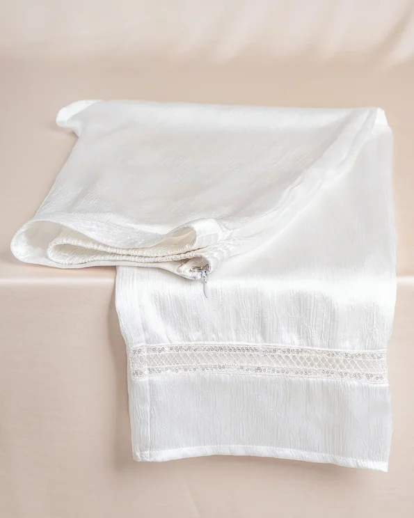 Product Description: A sleek white bottom with a stretchable elastic waistband for flexible fit and a side opening with a concealed zipper, secured with a metal hook closure for added hold. has a join lace and hemline, this bottom is perfect for pairing with kameez for festive-ready style.