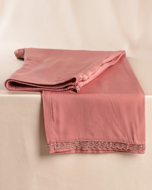 Product Description: A sleek Crepe Pink bottom with a stretchable elastic waistband for flexible fit and a side opening with a concealed zipper, secured with a metal hook closure for added hold. Finished with a refined hem and delicate detailing, this bottom is perfect for pairing with kameez for festive-ready style.