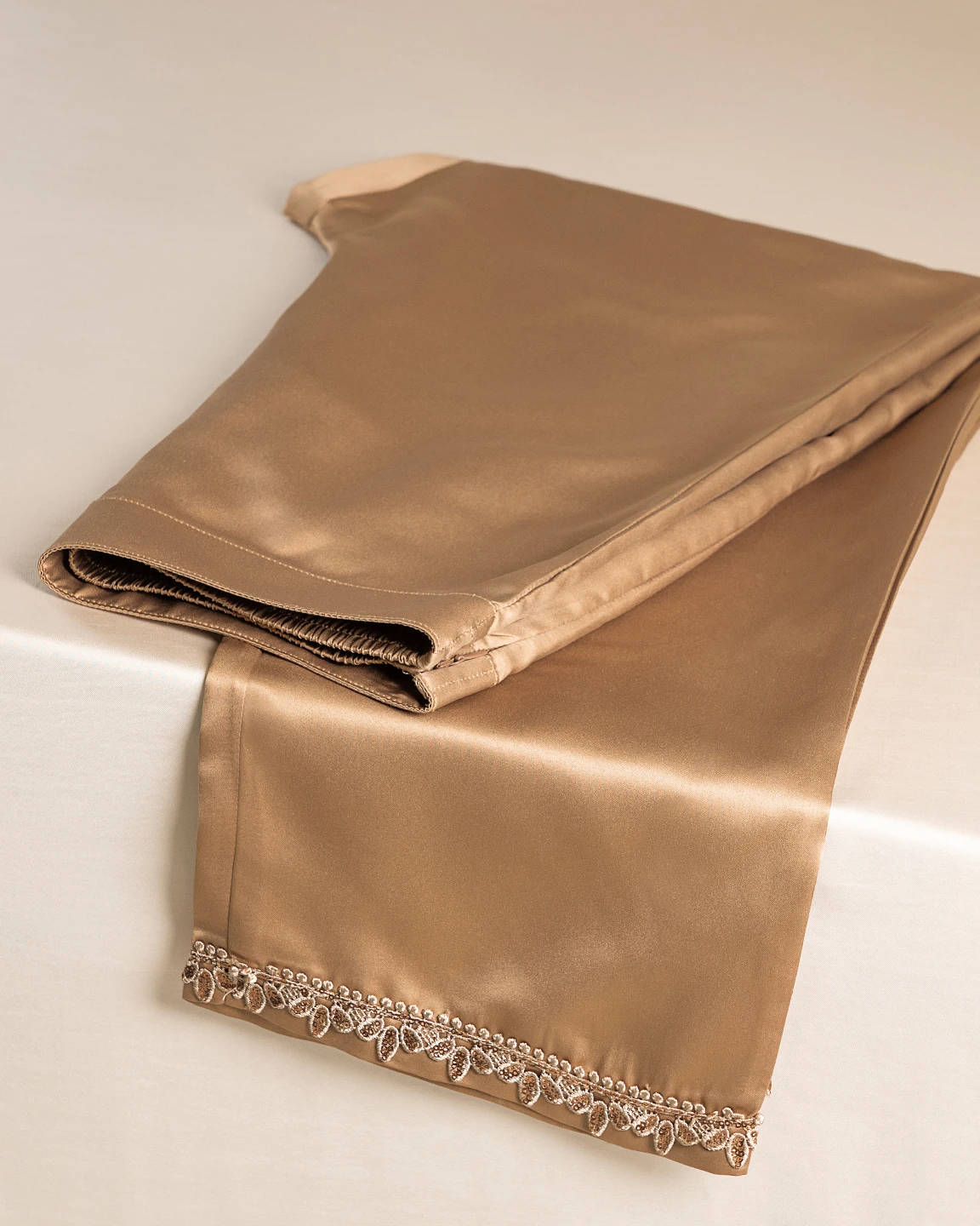 Product Description: Luxury Double Silk Regular Fit Bottom has wide hem details, has hemline lace detyails, has side zipper with hook details, has front waist band & back side has elastic.