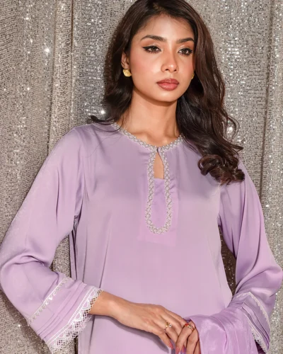 Product Description: A sleek Light Purple bottom with a stretchable elastic waistband for flexible fit and a side opening with a concealed zipper, secured with a metal hook closure for added hold. Finished with a refined hem and delicate detailing, this bottom is perfect for pairing with kameez for festive-ready style.