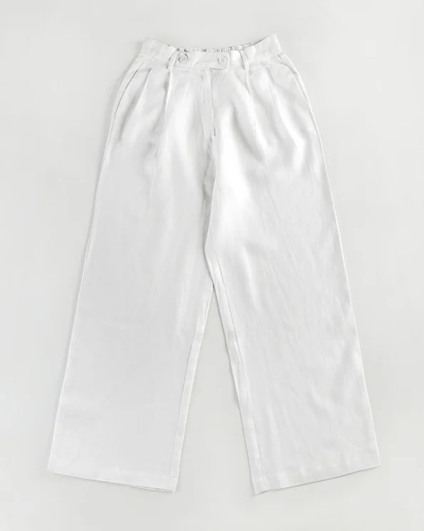 Product Details: Pure Luxury linen straight fit bottom has wide hem details, front waist has one side pleat details, has front zipper with button details.
