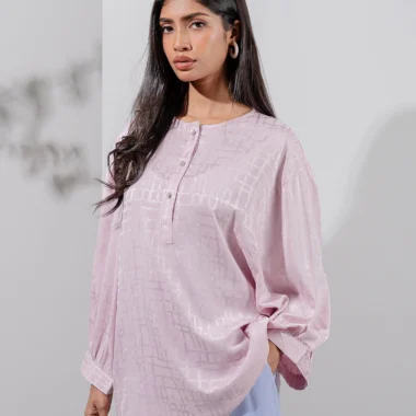 Luxuary Double Silk Casual tops has round neck details, has center front short button placket details, has full sleeve and dropped armhole details, has straight hemline.
