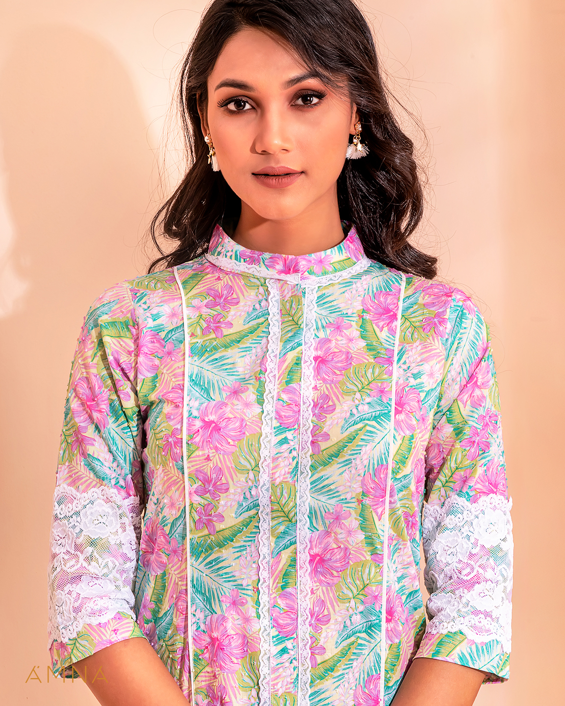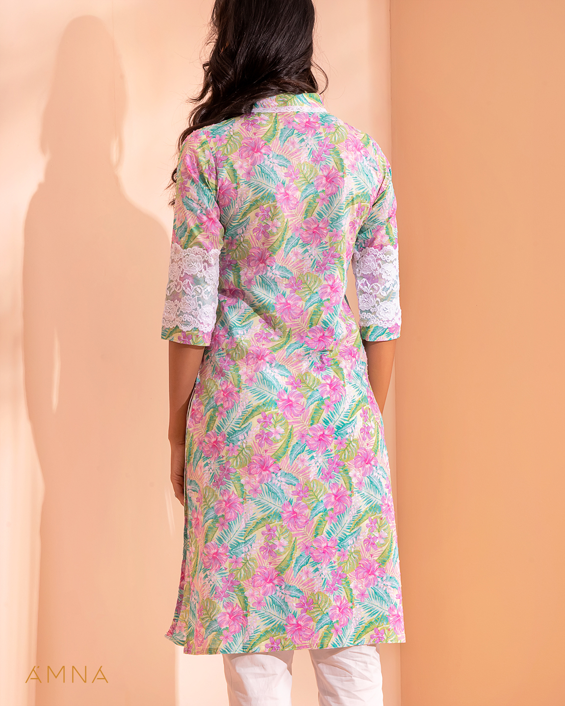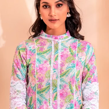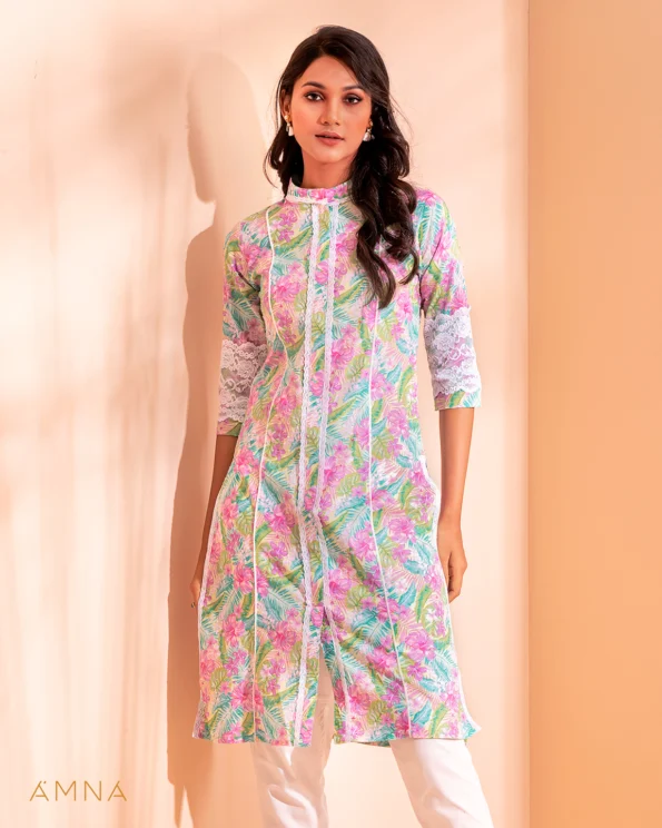 Sold OutFemale Center Front Lace Details Long Kurta By Amna | Butterfly Green