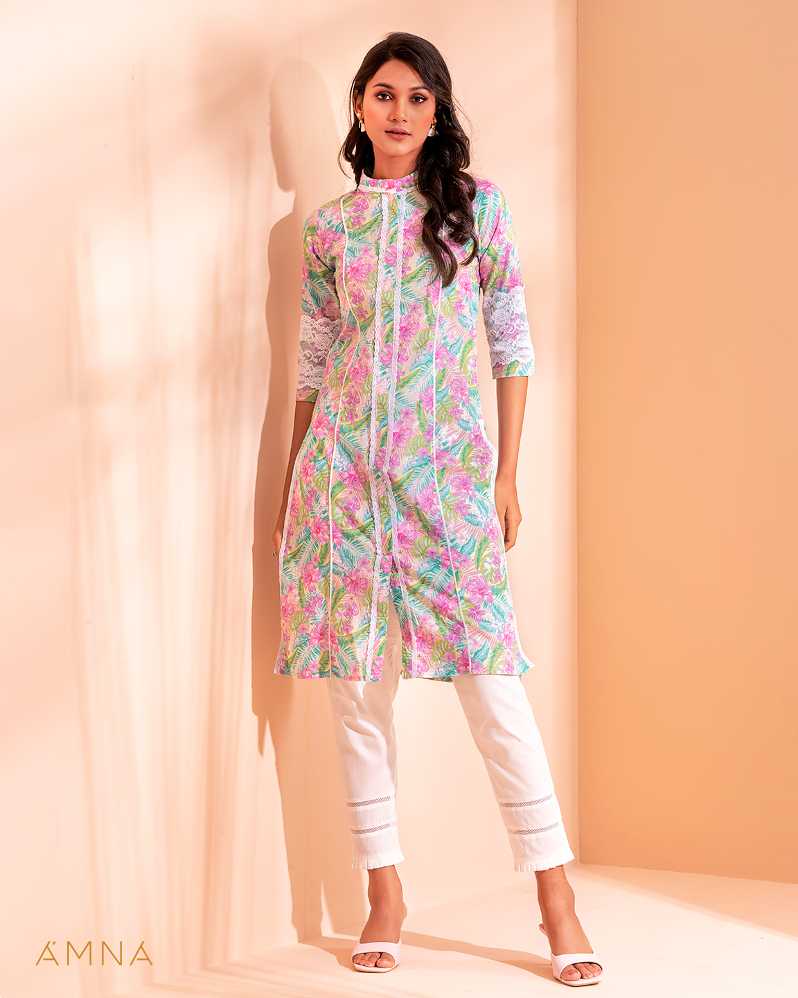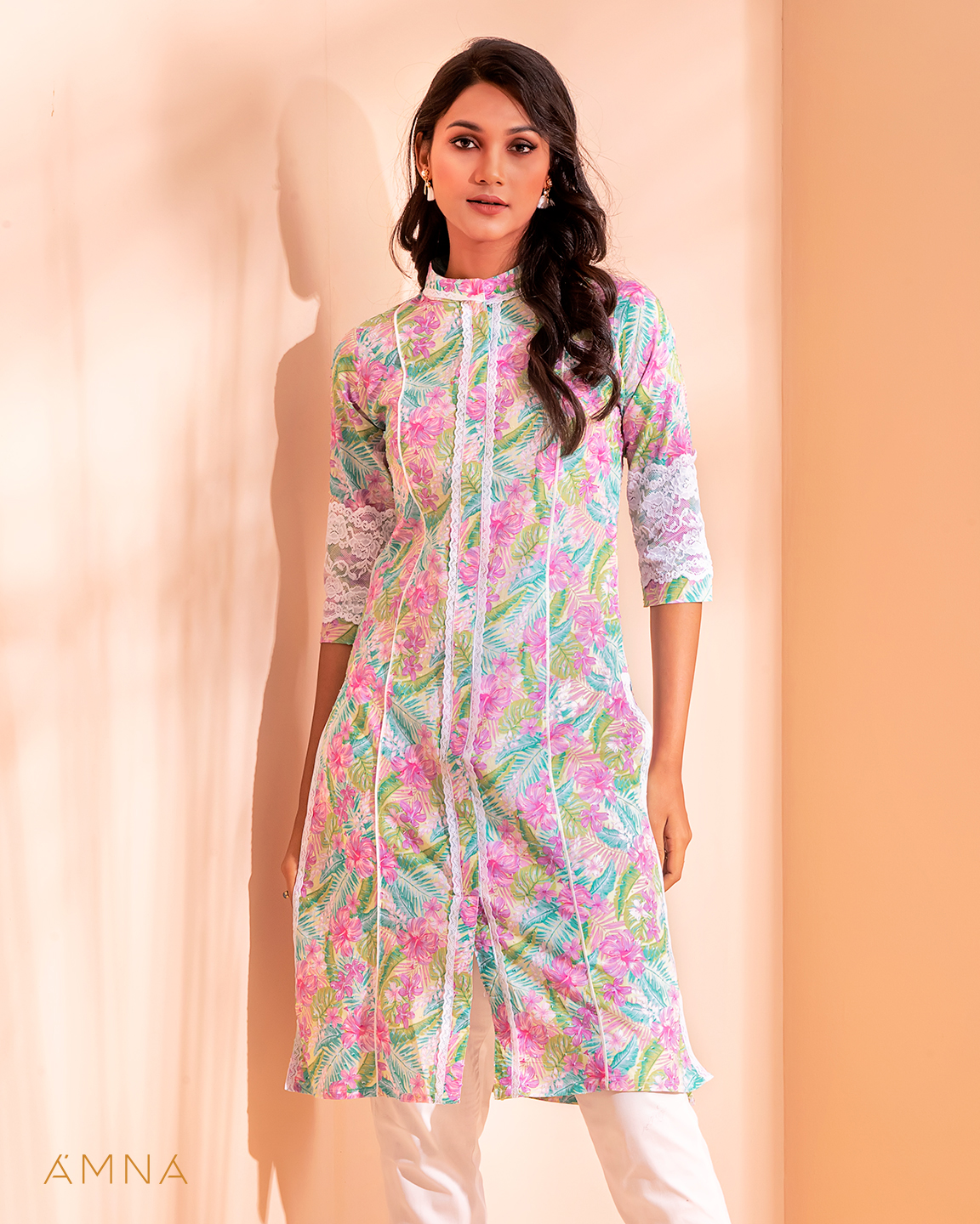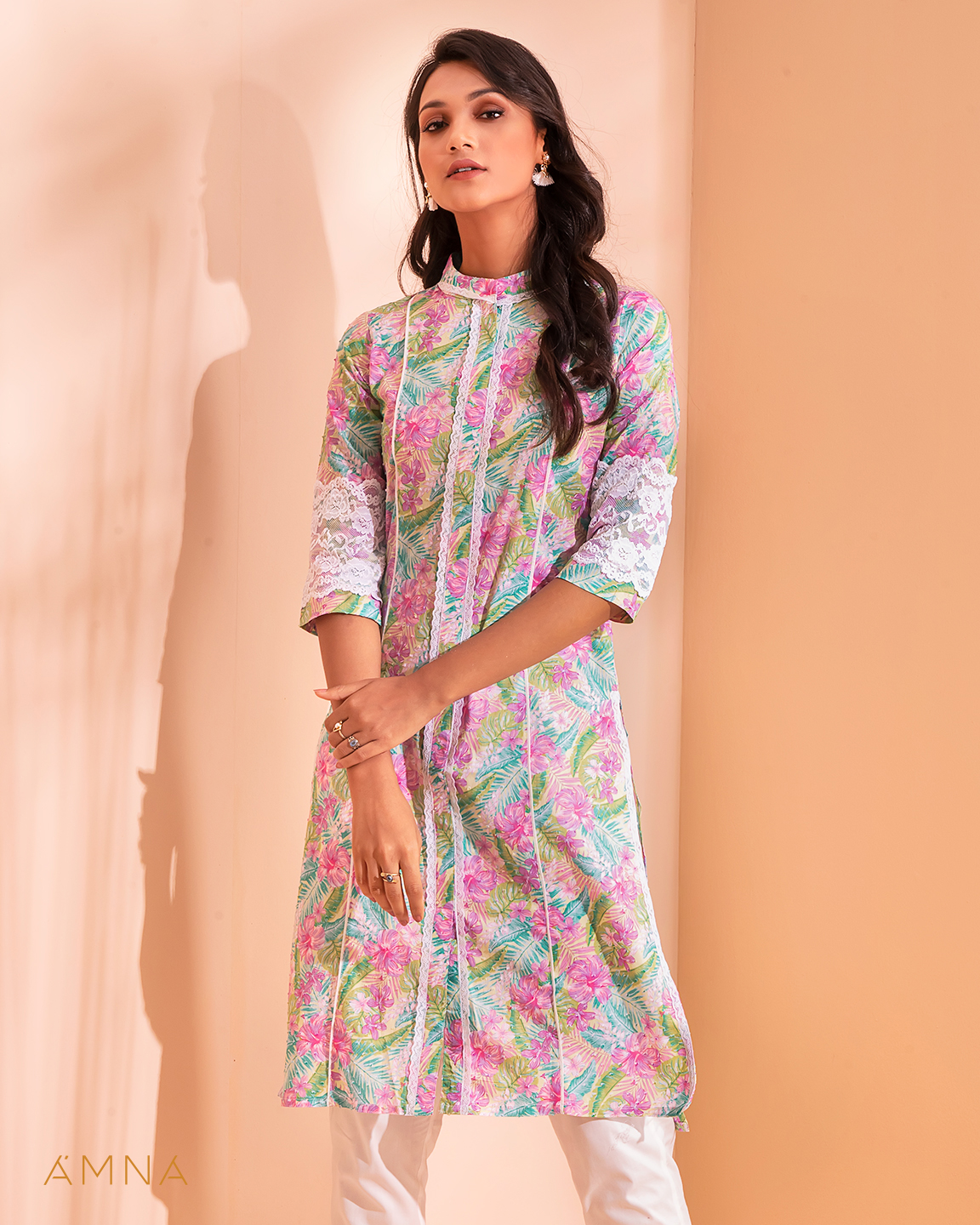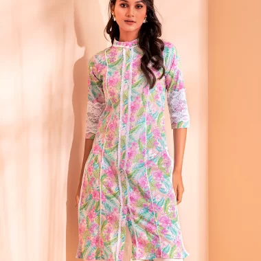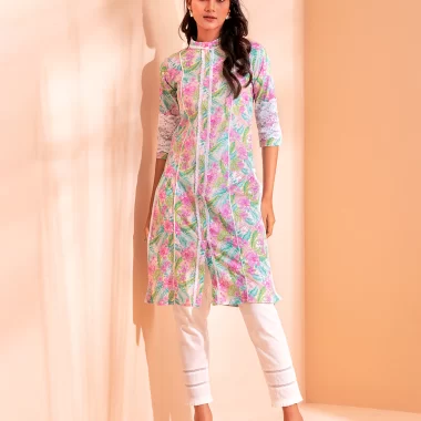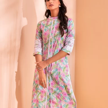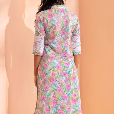 Cotton A-line long kurta has band collar with contrast lace details, center front has lace details & slit, has contrast pipin in princessline, has bothside slit with front slit lace details, has three quarter sleeve with lace details.