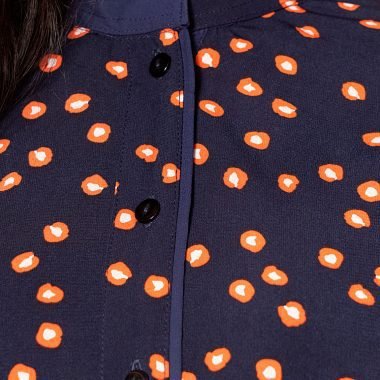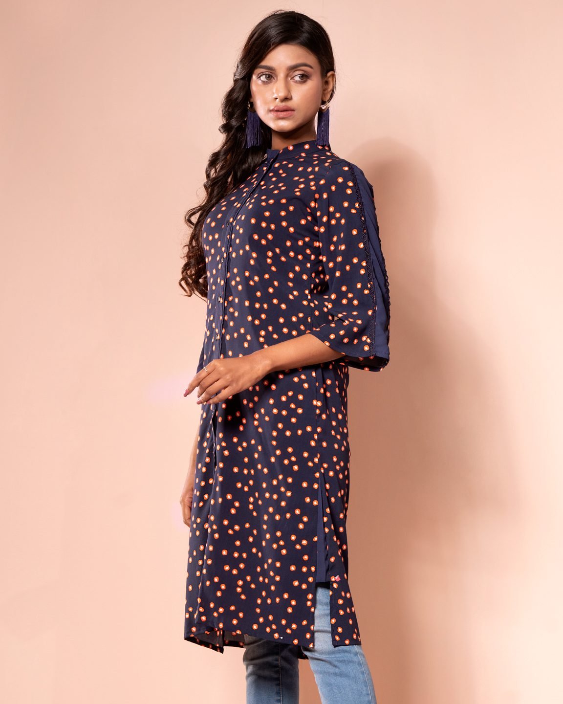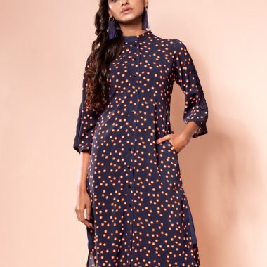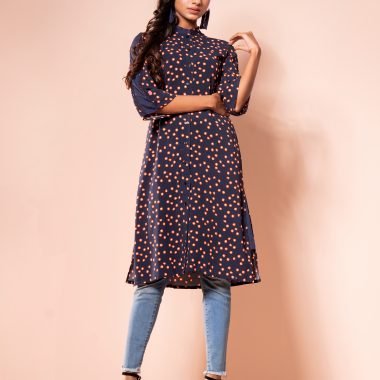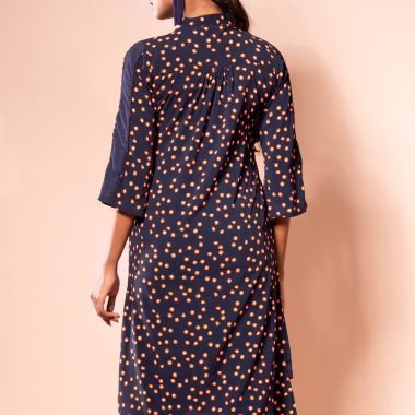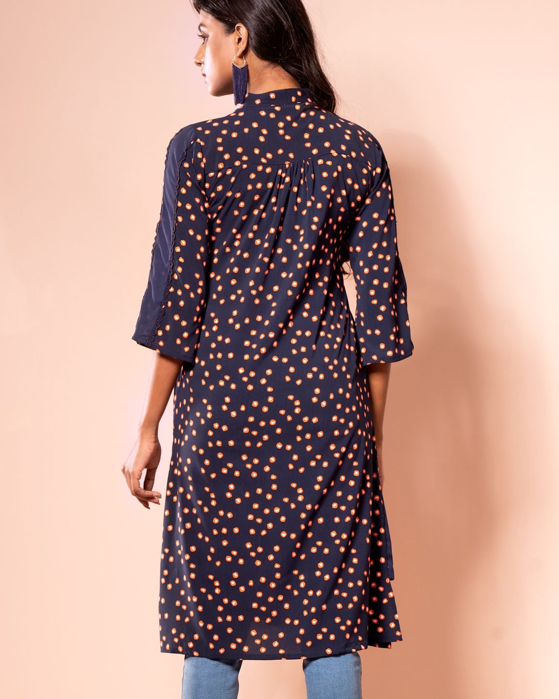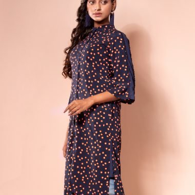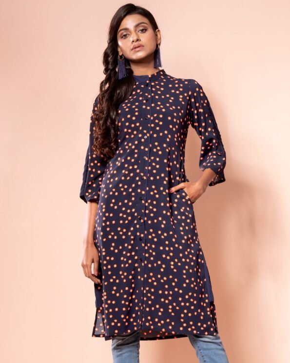 Georgette printed long shirt, has band collar with half contrast & inner band contrast, has contrast placket piping & inner placket contrast, has three quarter sleeve with contrast panel, both side pockets and gassed contrast, back yoke with center back gather.