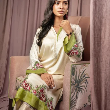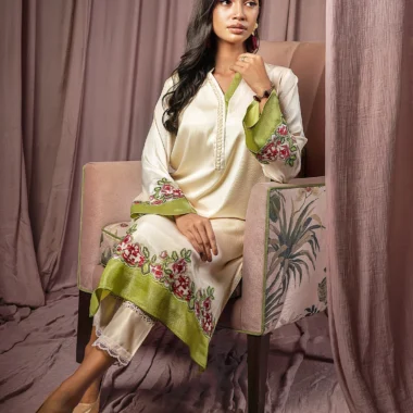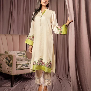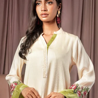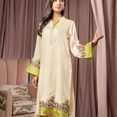 Luxury Double Silk regular fit long kamiz has half Band with V-neck with contrast & zardousi work detail, front hemline has contrast panel with embroidery details, has full sleeve with hemline has contrast panel with embroidery details has both side slit, has butter lining for comfort & easy.