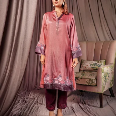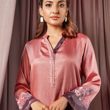 Luxury Double Silk regular fit long kamiz has half Band with V-neck with contrast & zardousi work detail, front hemline has contrast panel with embroidery details, has full sleeve with hemline has contrast panel with embroidery details has both side slit, has butter lining for comfort & easy.