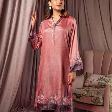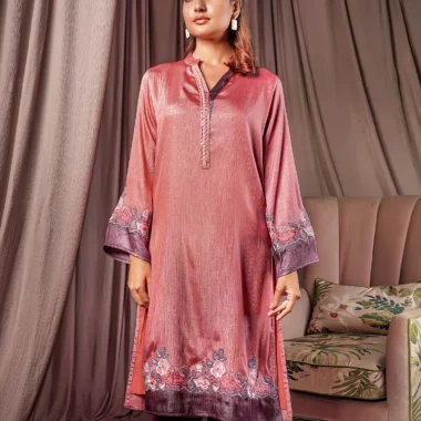 Female Contrast & Embroidery Details Regular Fit Long Kamiz | Geranium Pink