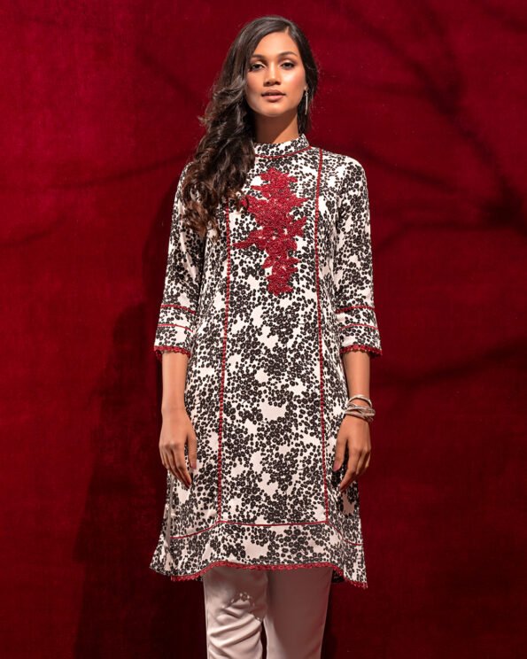 Female Contrast Embroidery Work & Lace Details Short kameez | Bright White