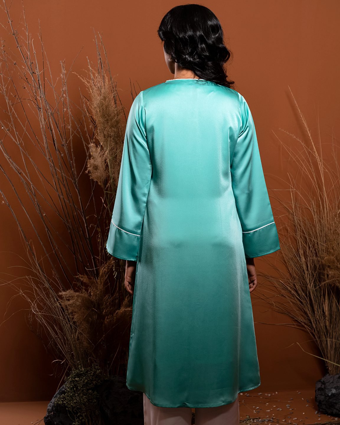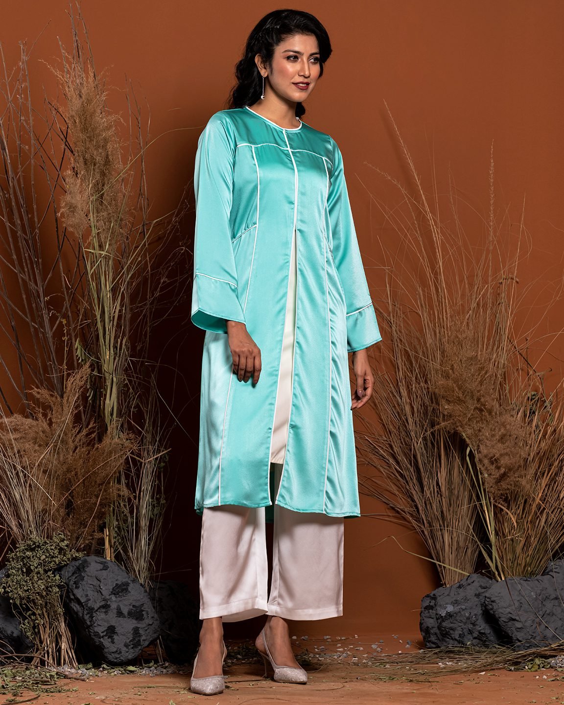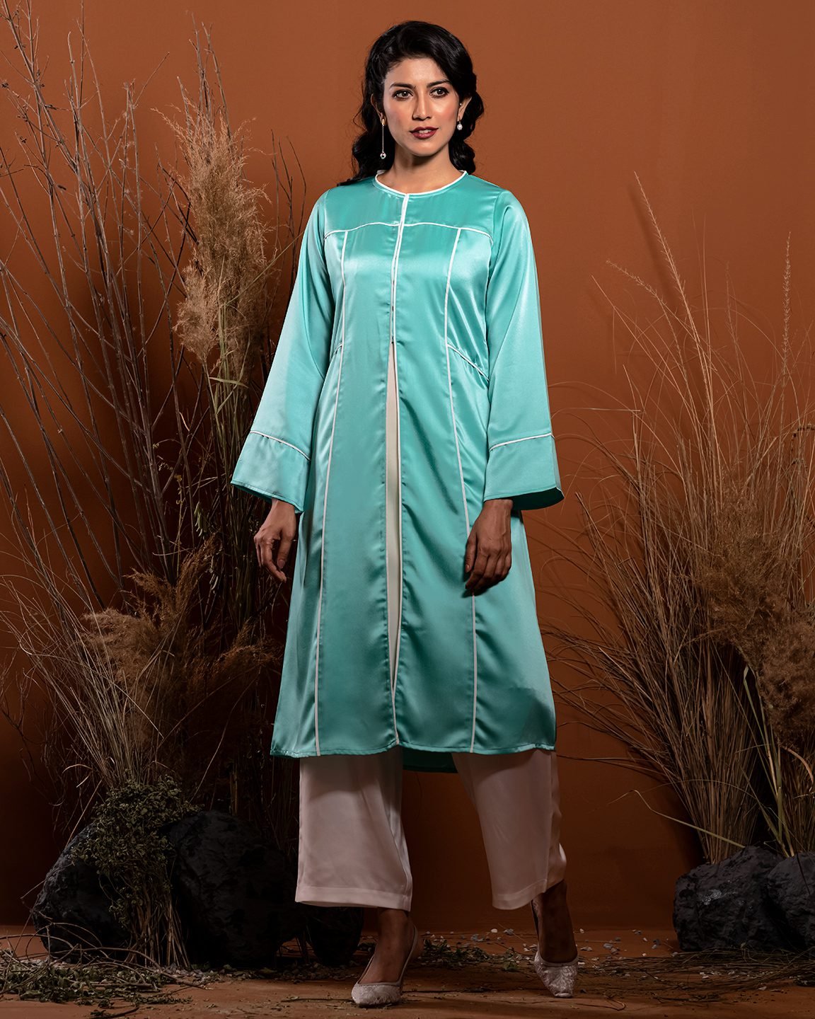 Round neck and front opening contrast piping with hook detail, long flare sleeve with contrast. Side pocket and front body contrast details.