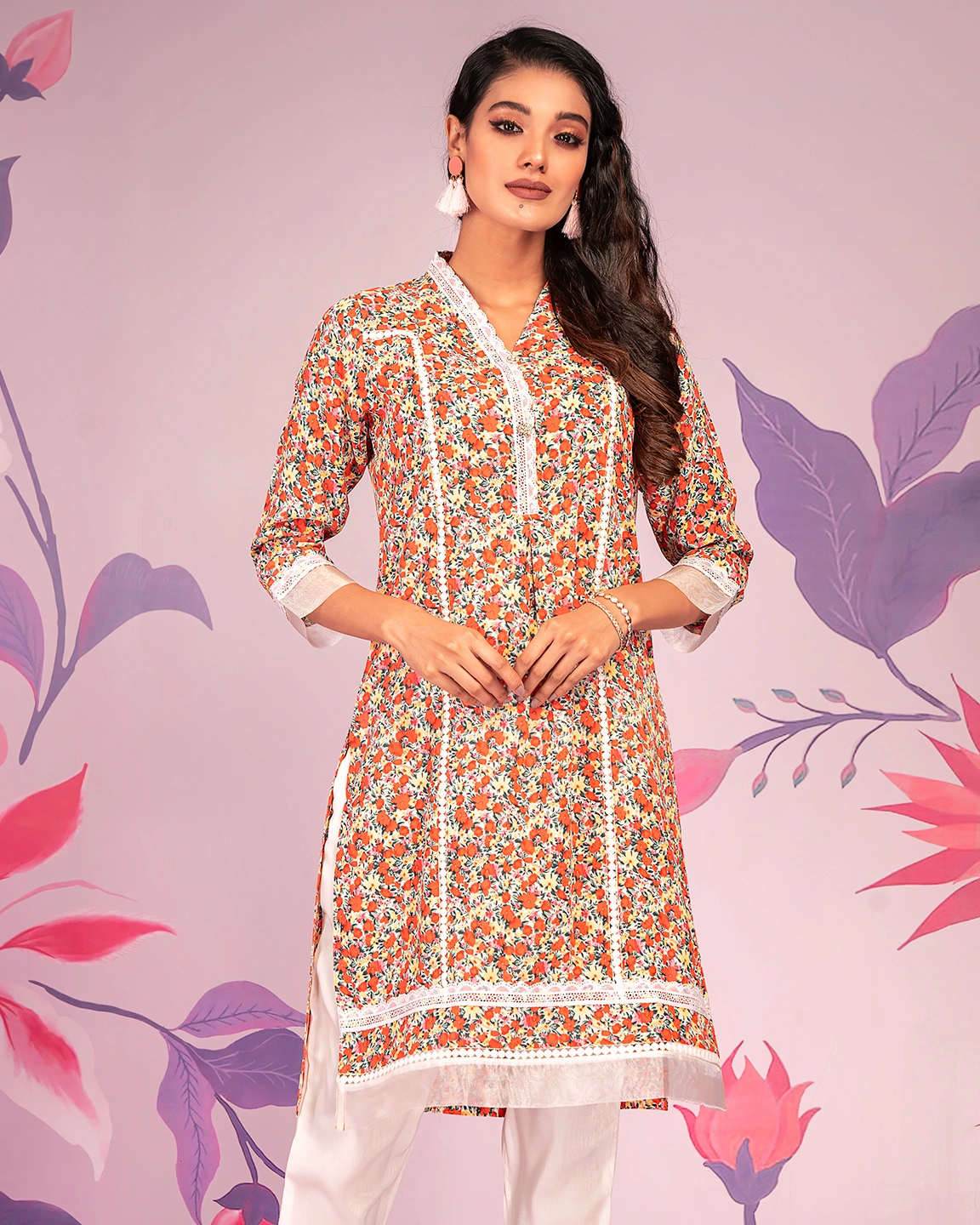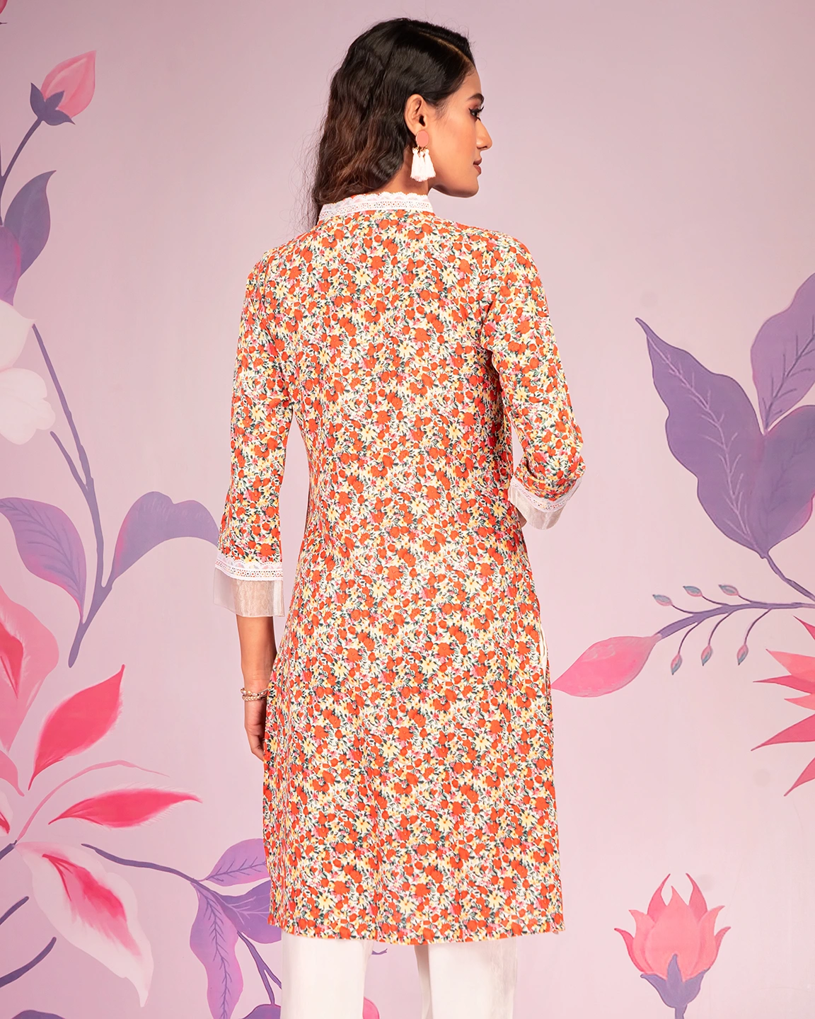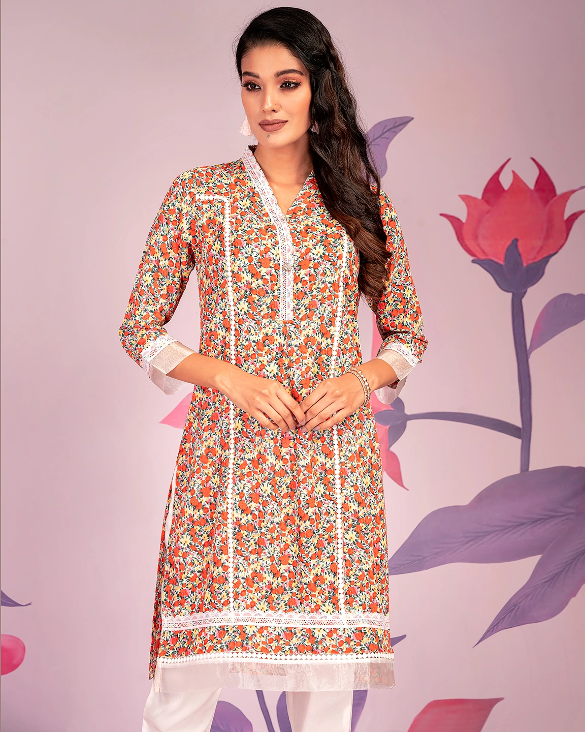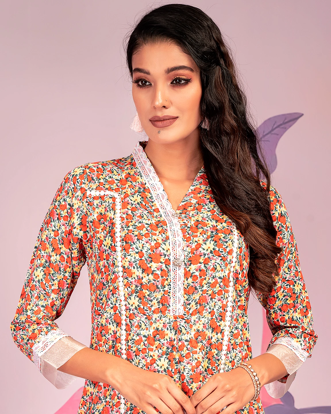 Georgette long kamiz has V- neck with lace details and ruffle, has front hem with contrast tissue with lace details, has full sleeve with contrast with lace details.