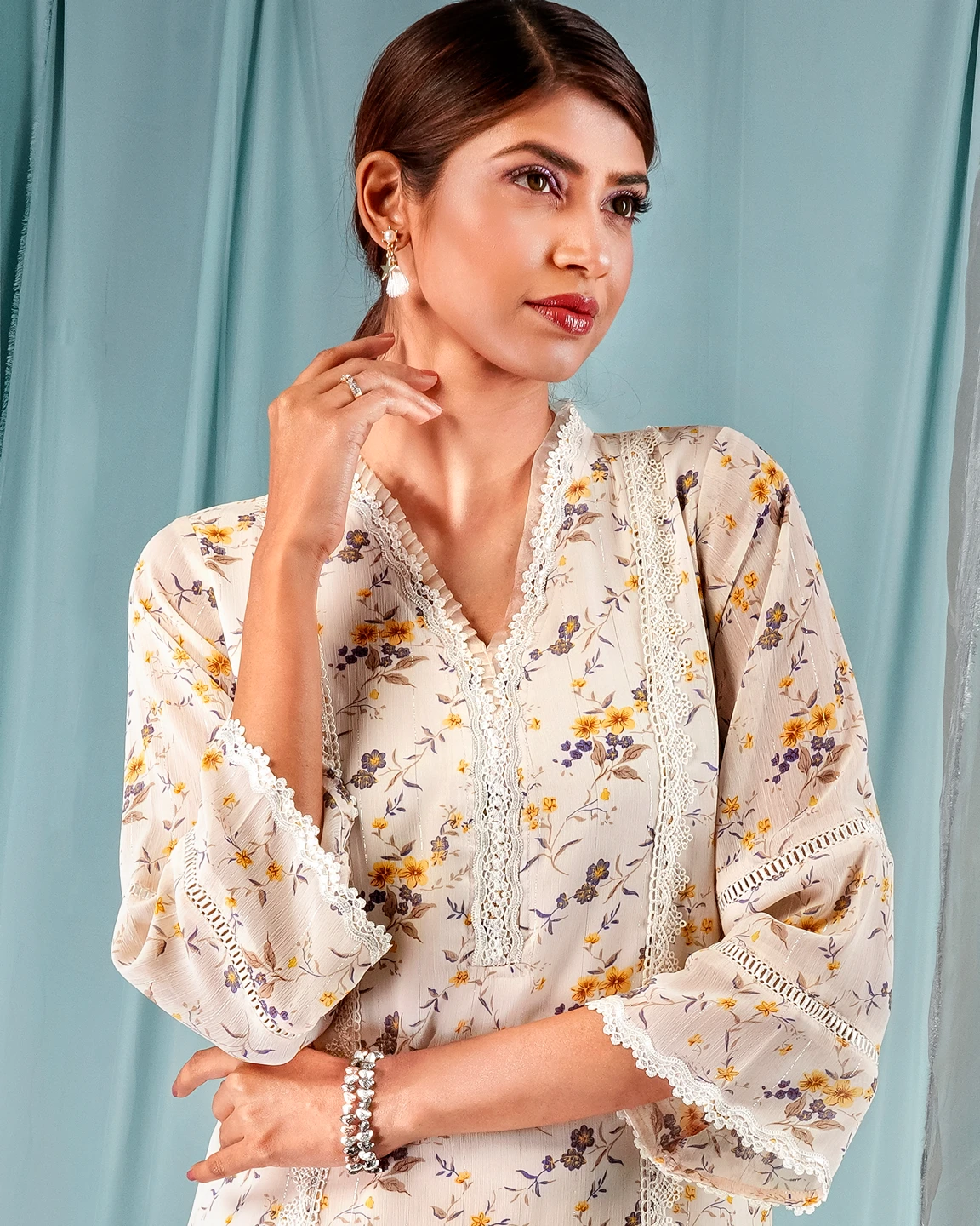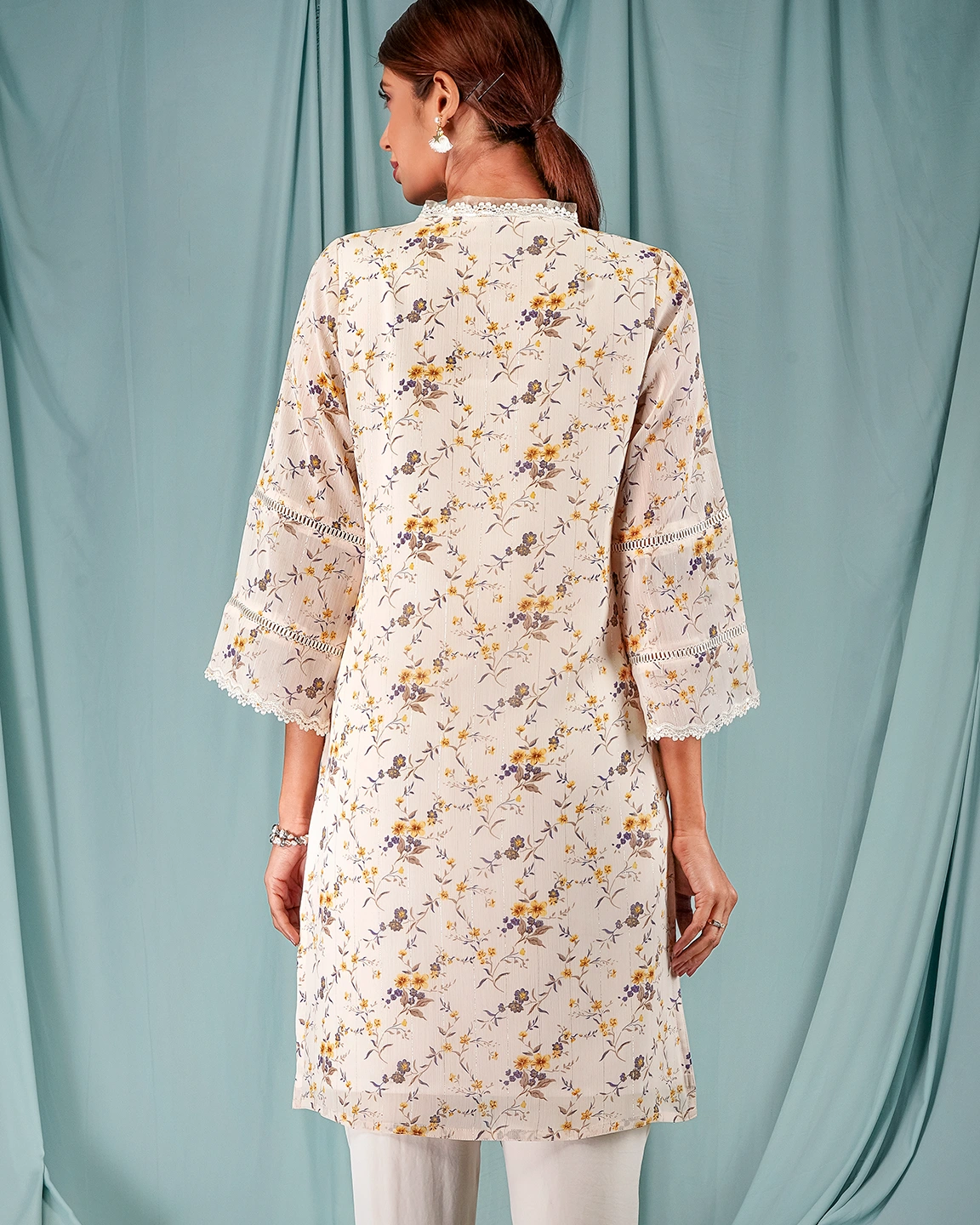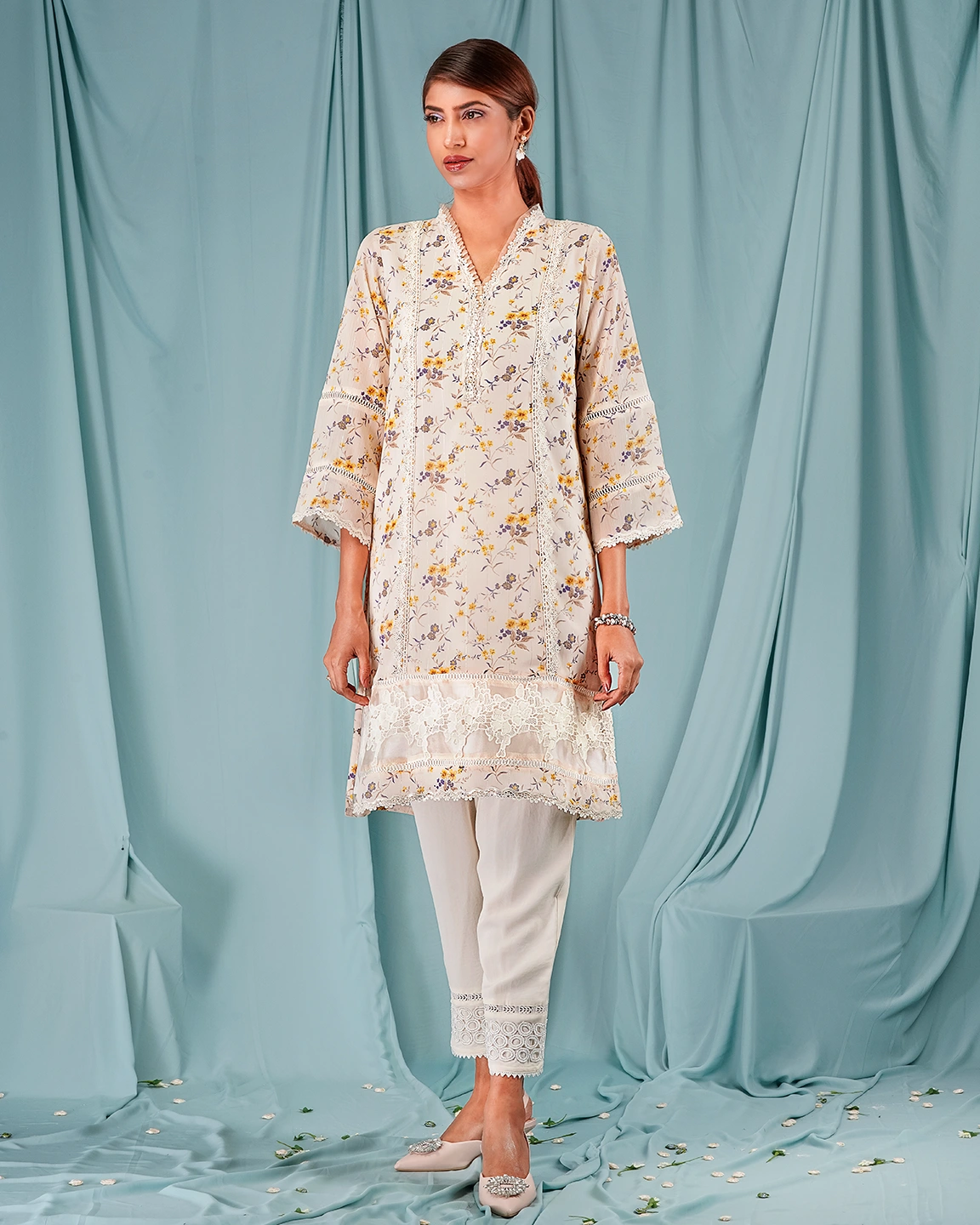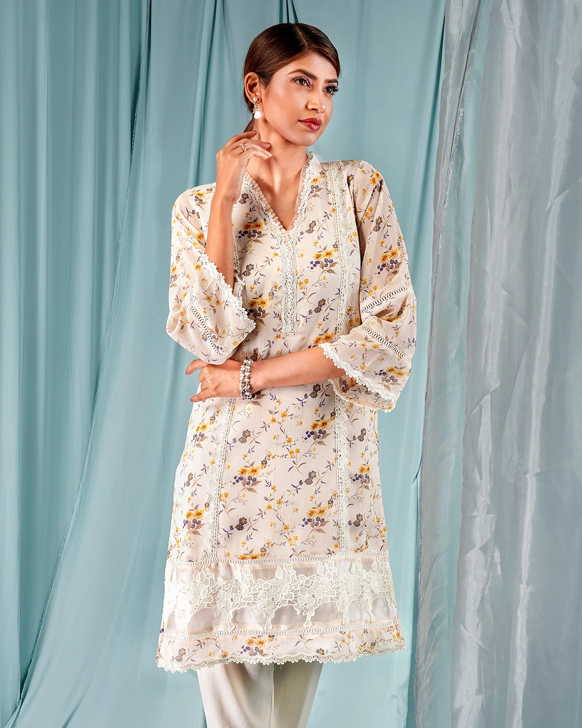 Georgette Short kamiz has v-neck with contrast tissue ruffle & lace details, has princessline lace details, has hemline contrast pannel with lace details, has hemline lace details, has full sleeve lace details, has butter lining for easy & comfort.