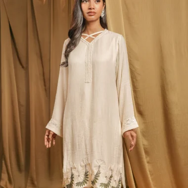 Crinkle Chiffon Georgette loose fit Short kamiz has fusion v-neck details, front neckline has hand karchupi work details, has full sleeve with lace details, hemline has hand emboidery work details, back side has zipper and button details, has both side slits with attached lining for comfort & easy.