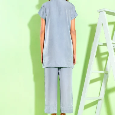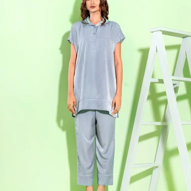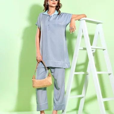 Female Cuban Collar Details Luxury Double Silk Co-Ord Set | Skyway Blue