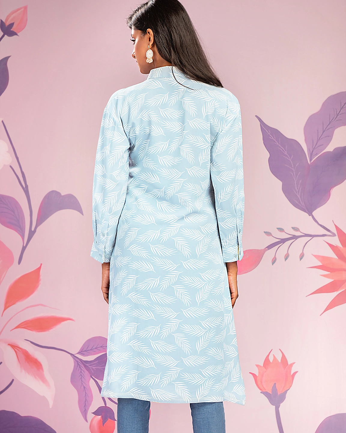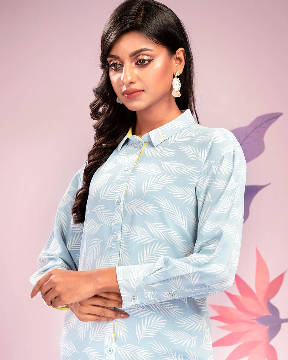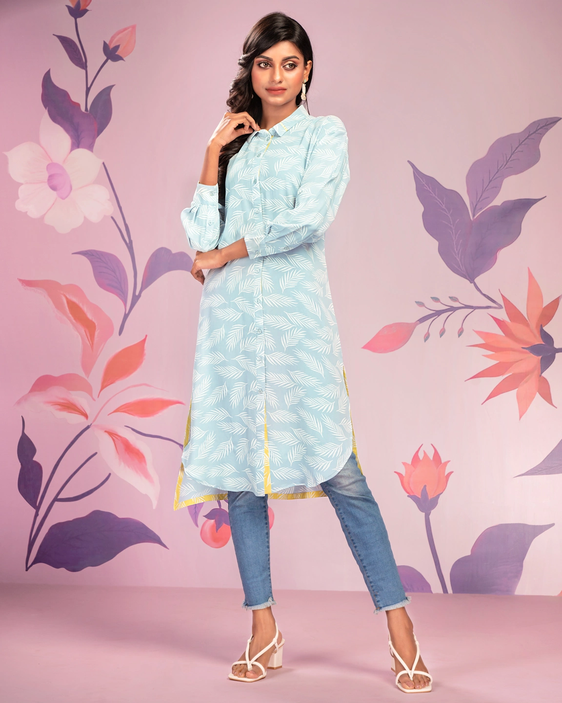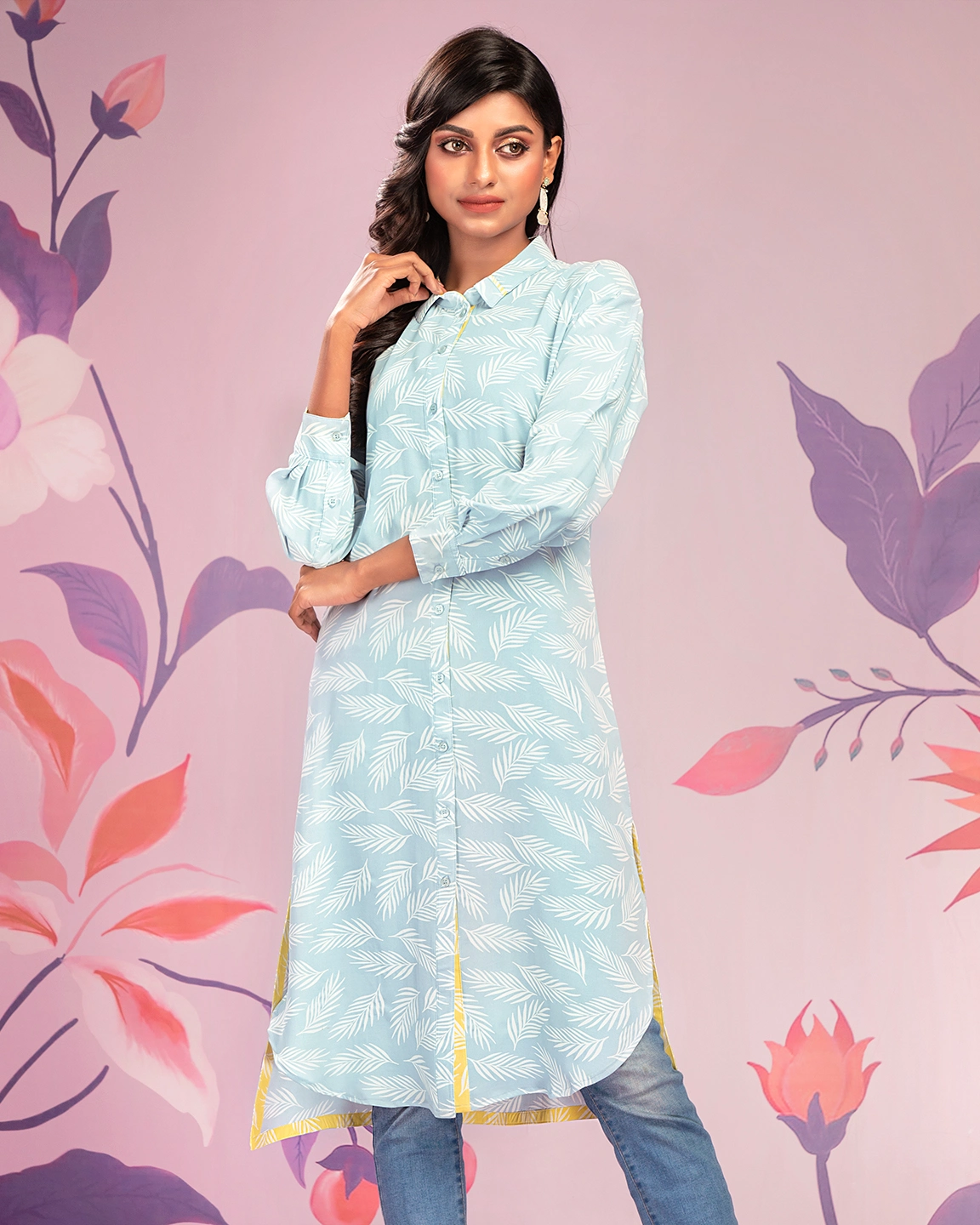 Georgette casual top has shirt collar with contrast join, has inner contrast band, has center front button placket with inside contrast , hemline has curve shaped, has three quarter sleeve with inside contrast cuff, has back hem has inside contrast panel.