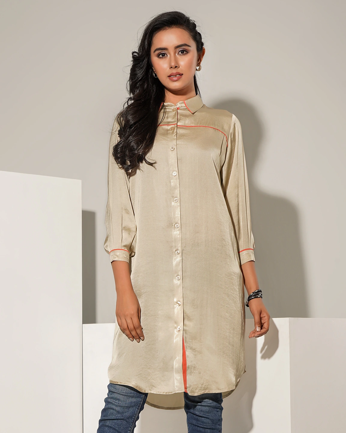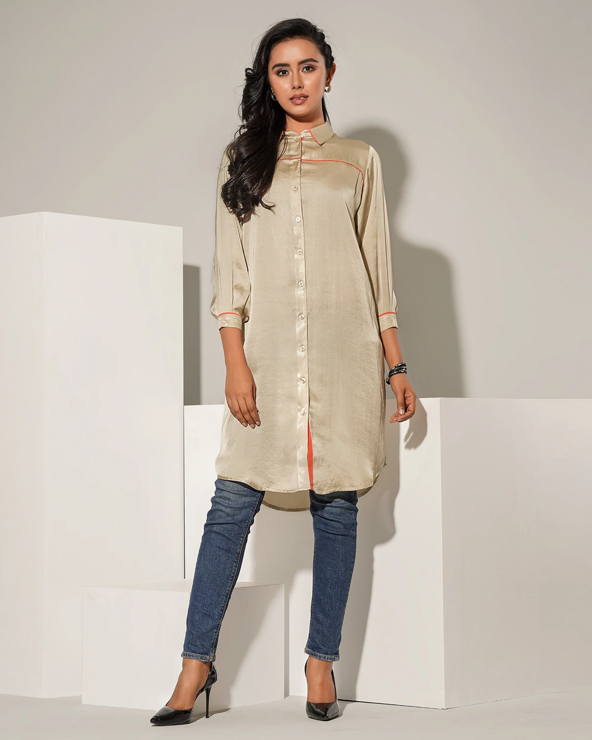 Silk casual top has shirt collar with contrast pipin, has center front button placket with inside contrast, front part has bothside dart, front yoke has contrast pipin, has curved hemline, back part has back yoke with contrast pipin & box pleate, has full sleeve with cuff & contrast pipin.
