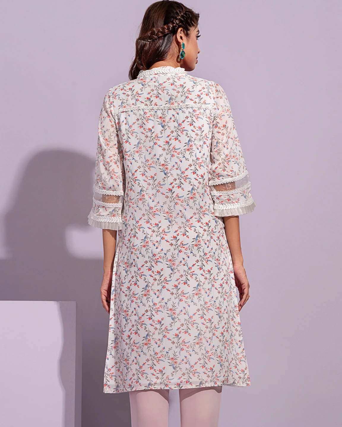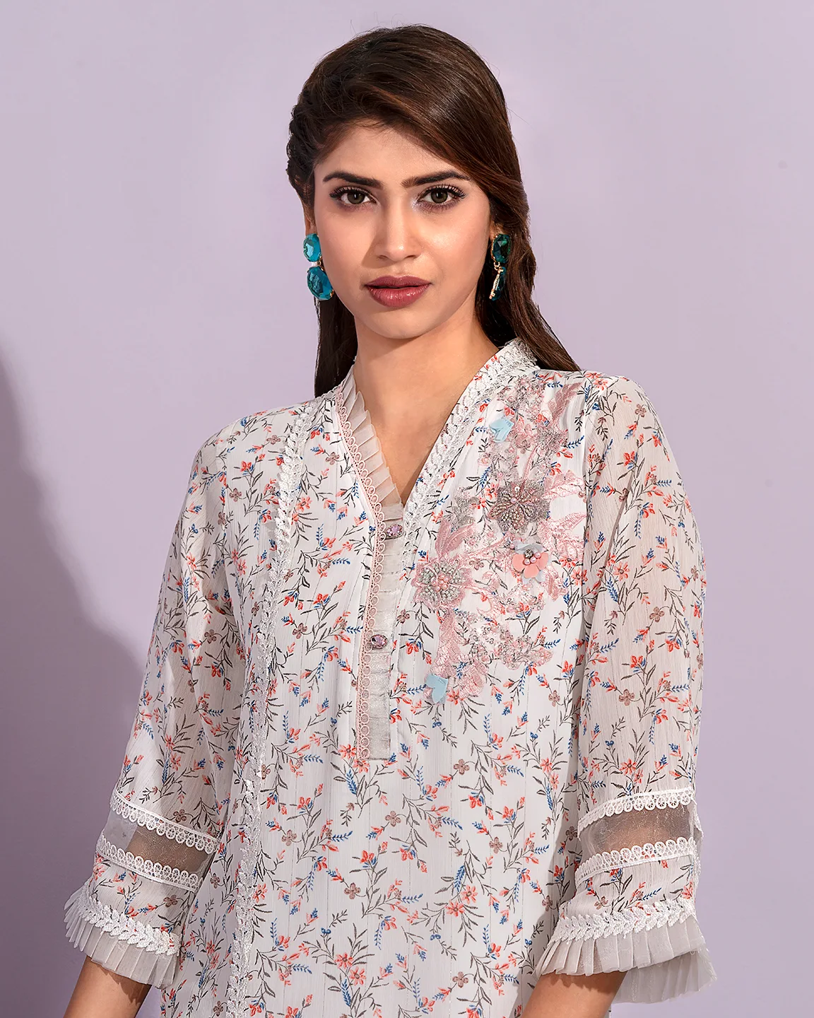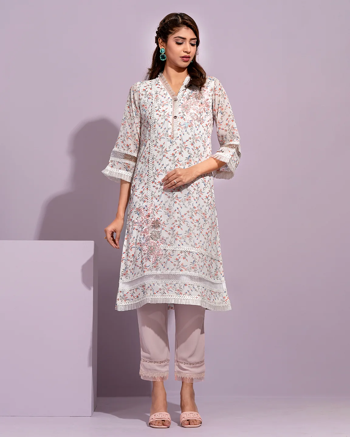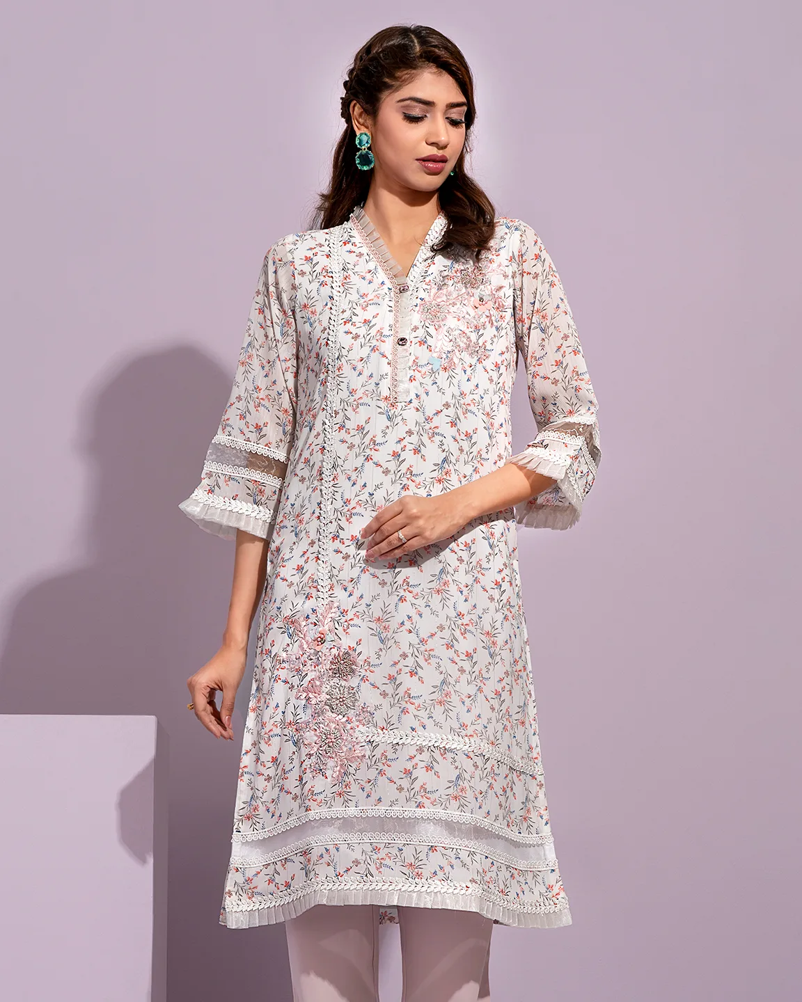 Sold OutFemale Front Part Hand Embroidery Work With Lace Details Long Kamiz | White