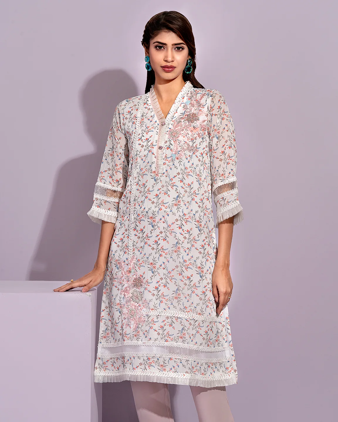 Fine Zari Crepe Georgette long kamiz has v-neck with contrast ruffle & lace details, front part has lace details & hand embroidery work, has hemline contrast with lace details, has hemline contrast ruffle with lace details, has bothside slits, has three quarter sleeve with contrast panel, hemline contrast ruffle with lace details, has butter lining for comfort & easy.