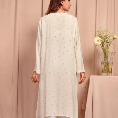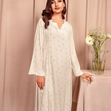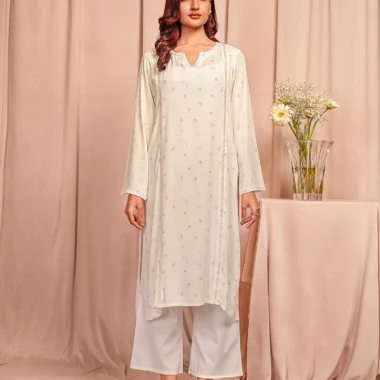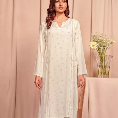 Viscose A-line kamiz has round-neck with v shaped slit, neckline has lace details, front princessline has join lace details, has full sleeve with hemline slit & lace details, has bothside slits.